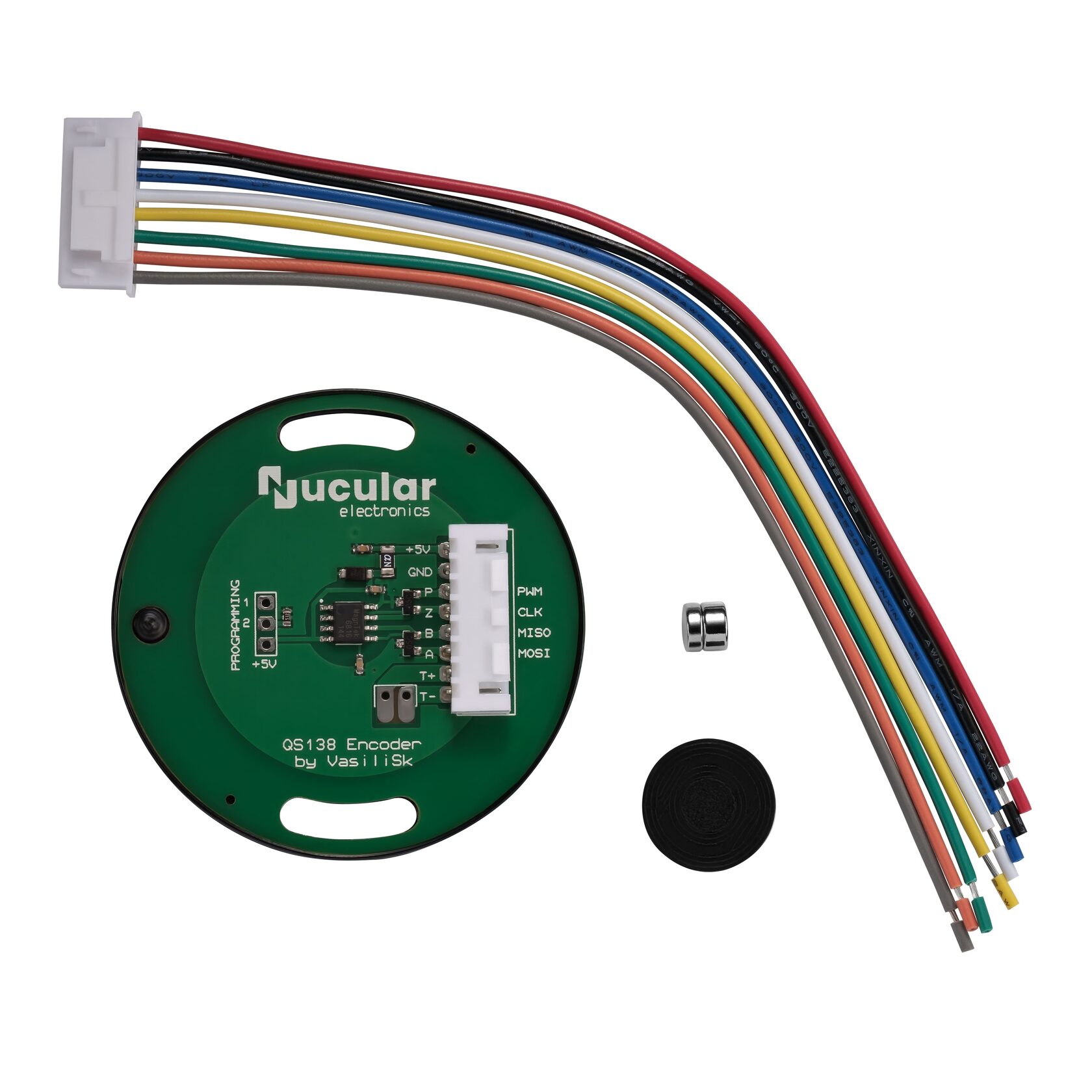 Это ABZ+PWM энкодер на 1024 импульса. В комплекте плата, провода с разъемом, два магнита разной толщины и пластиковые адаптеры для установки.