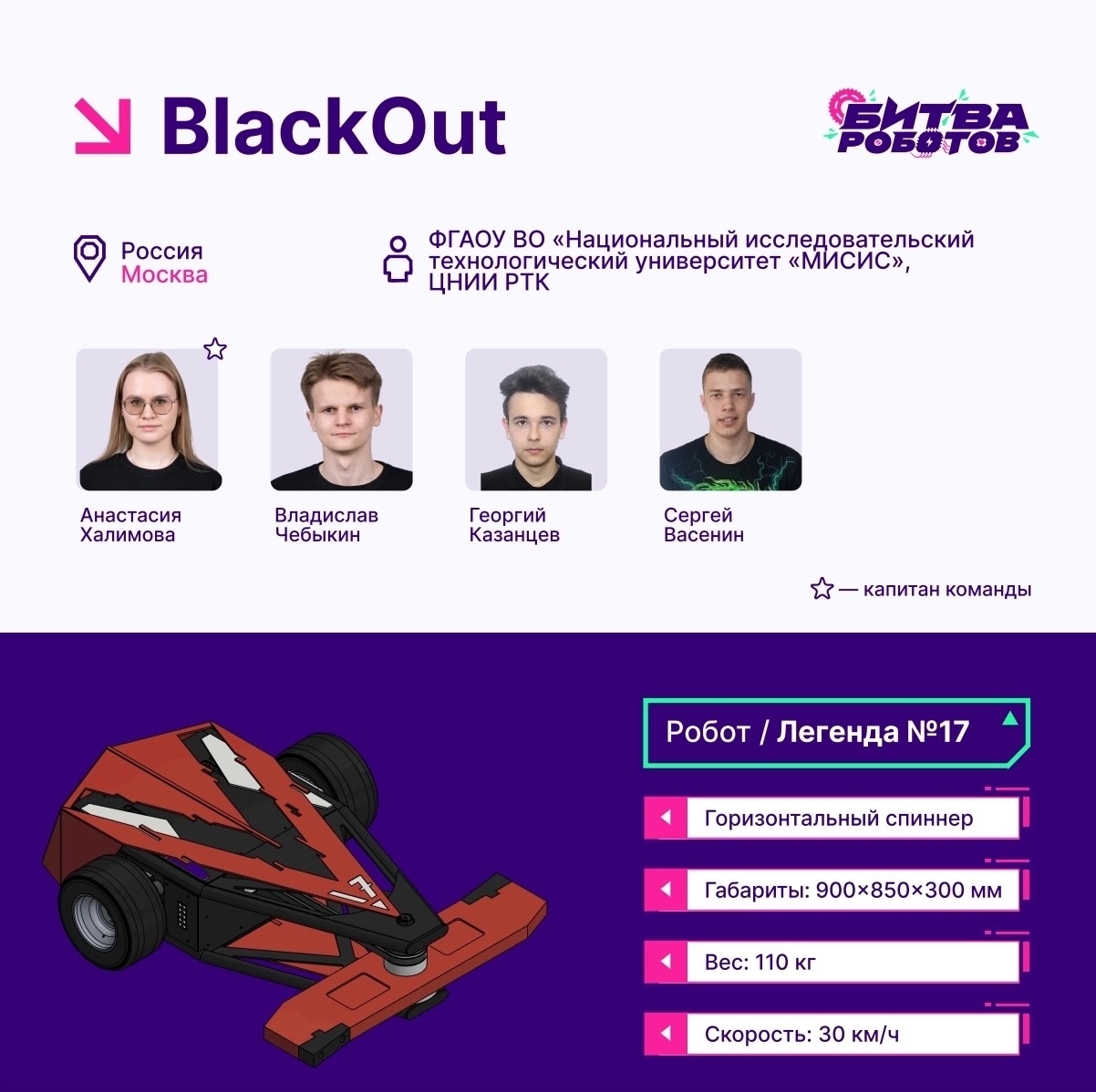 В этот раз команда BlackOut студентов из МИСИС особо отличилась. Они вышли в финал международного чемпионата «Битва роботов — 2025» со своим роботом в весовой категории до 110 кг. Всего было 112 команд-участников, даже из Ирана! Робот Легенда №17 команды BlackOut оснащен контроллером Nucular P24F, который управляет электродвигателем горизонтального спиннера — основным оружием для боя.